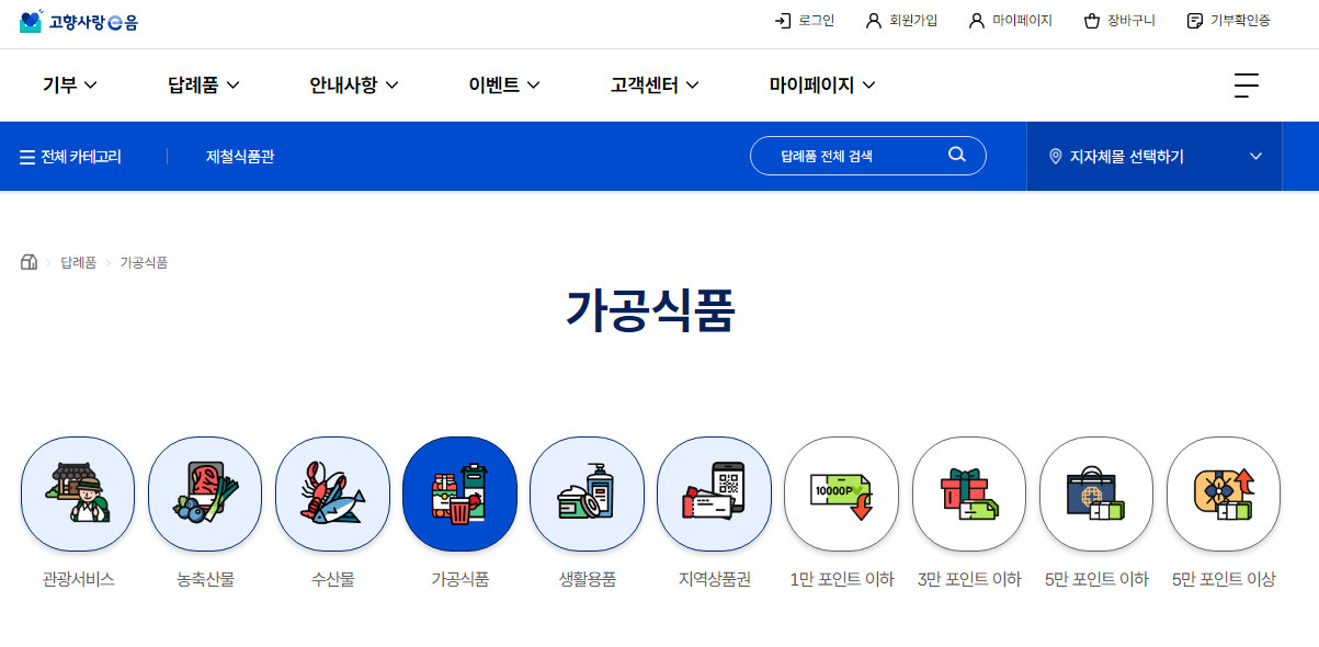 여기서 전국의 모든 기부처와 답례품을 한눈에 보고, 기부까지 한 번에 할 수 있어요.