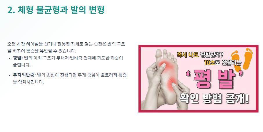 오랜 시간 하이힐을 신거나 잘못된 자세로 걷는 습관은 발의 구조를 바꾸어 통증을 유발할 수 있습니다.