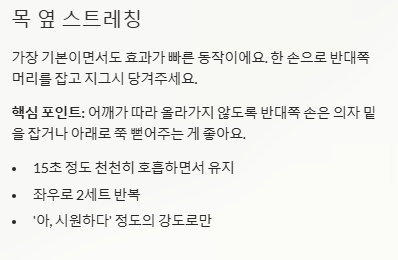 절대 반동을 주거나 세게 누르지 마세요! 목 근육은 예민해서 다치기 쉬워요. '아, 시원하다' 정도의 느낌으로만 부드럽게 늘려주세요.