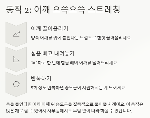 양쪽 어깨를 귀에 붙인다는 느낌으로 힘껏 끌어올렸다가, '툭' 하고 힘을 빼며 내려놓으세요. 5회 정도 반복하면 어깨 위 승모근이 시원해지는 게 느껴질 거예요.
