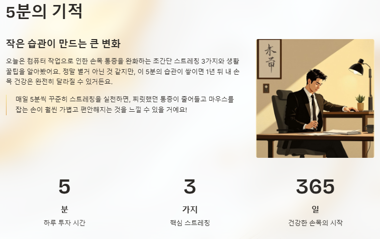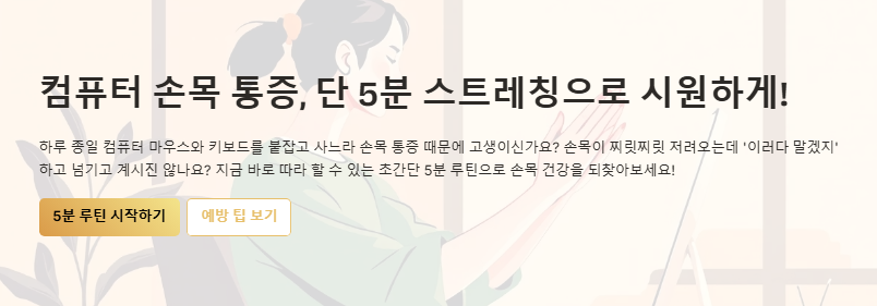 매일 5분씩 꾸준히 스트레칭을 실천하면, 찌릿했던 통증이 줄어들고 마우스를 잡는 손이 훨씬 가볍고 편안해지는 것을 느낄 수 있을 거예요!