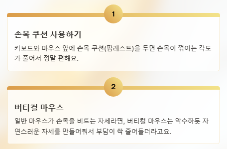 ✅ 손목 쿠션 사용하기: 키보드와 마우스 앞에 손목 쿠션(팜레스트)을 두면 손목이 꺾이는 각도가 줄어서 정말 편해요.