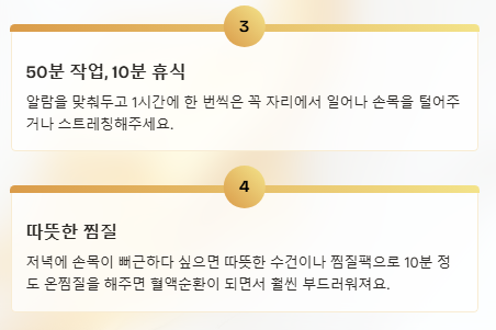 ✅ 따뜻한 찜질: 저녁에 손목이 뻐근하다 싶으면 따뜻한 수건이나 찜질팩으로 10분 정도 온찜질을 해주면 혈액순환이 되면서 훨씬 부드러워져요.