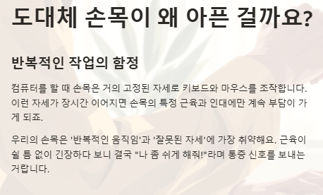 저도 예전에 하루 10시간씩 컴퓨터 작업을 하다가 손목이 너무 아파서 마우스 잡기가 무서웠던 적이 있거든요.