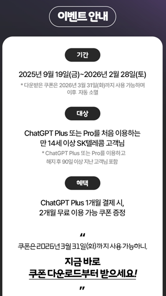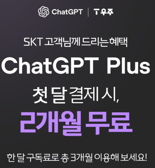 2025년 하반기부터 SKT T우주를 통해서 챗GPT 플러스를 결제하면, 1달 가격에 총 3개월을 이용할 수 있는 1+2 프로모션이 시작된다고 해요!